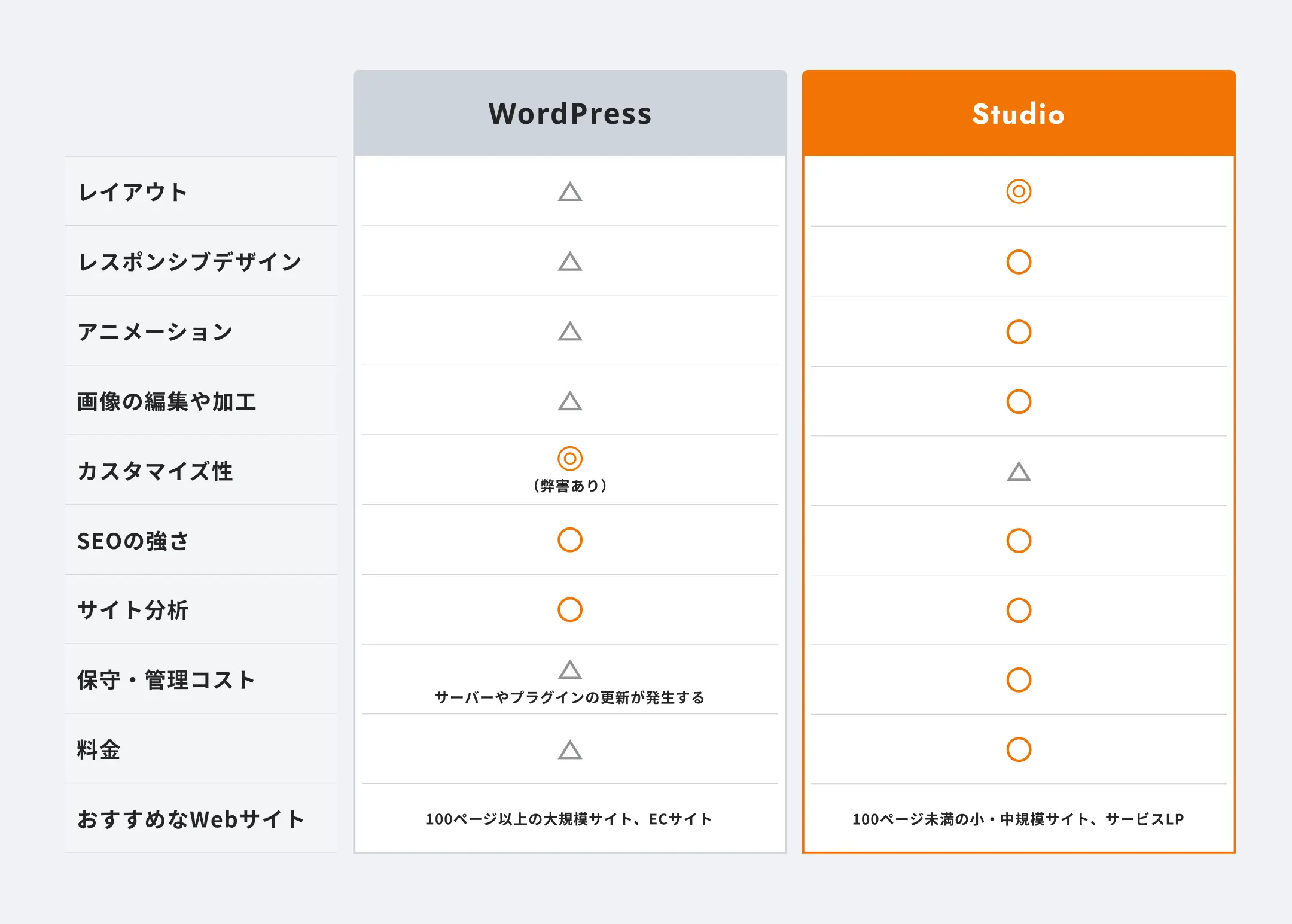 次章で詳しく解説しますが、保守管理の外注コストを考慮すると、Studioの方がトータルで安くなる可能性があります。